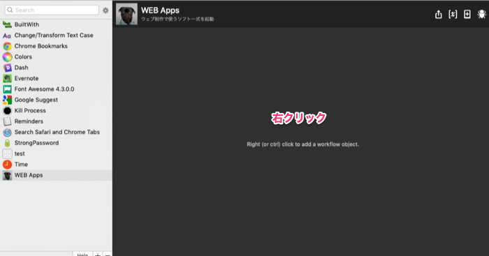 Workflowの作成ウインドウが表示されるので、画面上で右クリックします。