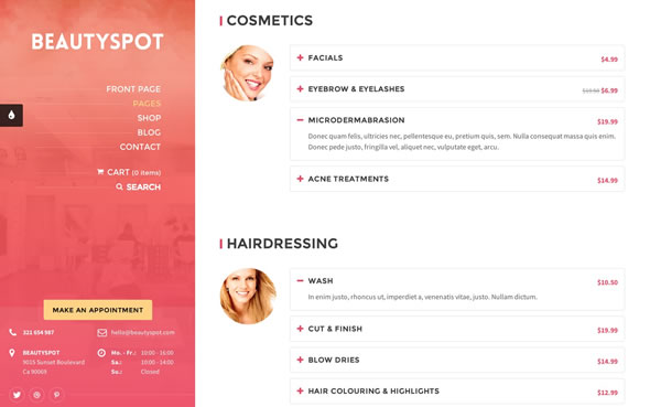 美容院・美容室、コスメ、ヘアサロン、ネイルサロン、アイラッシュスタイリスト、フィットネスジム、リラクゼーションサロン、スパ等、美容関連のホームページ製作をイメージしたWordPressテーマです。