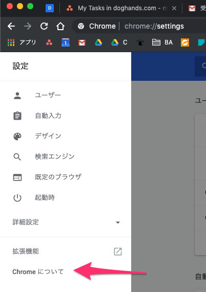 今度は左の「設定」をクリックして、サイドバーを開き、一番下の「Chromeについて」をクリックします。