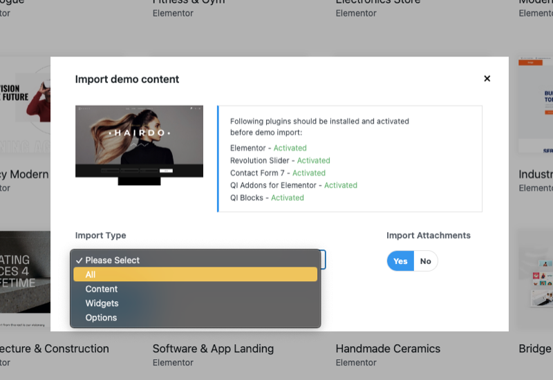 ポップアップでは、必要なプラグインやインポートタイプ(すべて、コンテンツ、ウィジェット、オプション情報)、添付ファイルの有無などを選択できます。