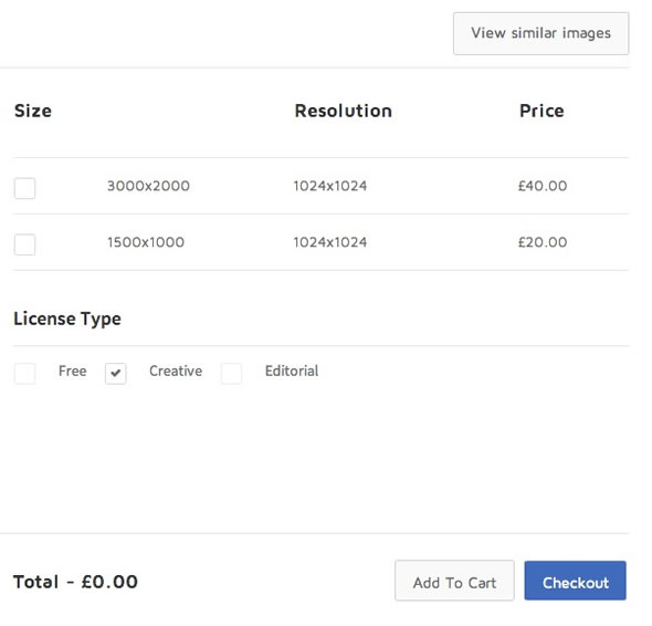 サイズやライセンス種別、類似画像へのリンク、お気に入り登録、カートへの追加ボタン等が表示されます。
