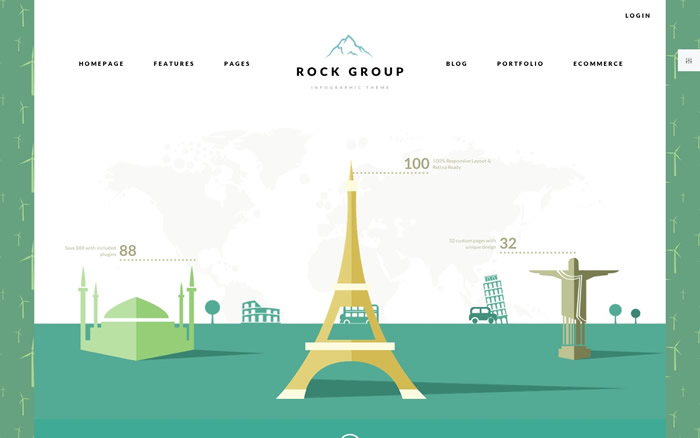 豊富なアニメーションチャート、グラフ等のパーツが用意された、インフォグラフィックページ構築用のワードプレステーマ。