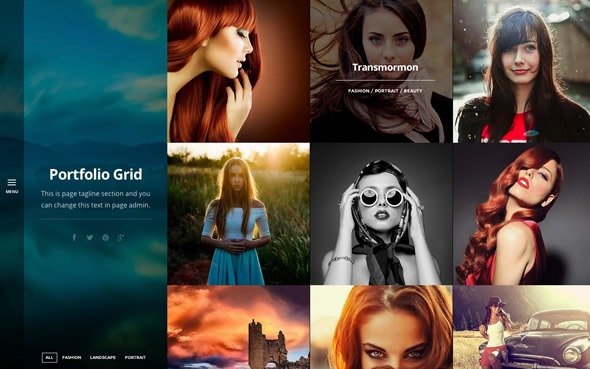 ポートフォリオページのレイアウトは、グリッド、大きさの異なる画像が並ぶメイソンリー、縦スクロールタイプ等が用意されています。