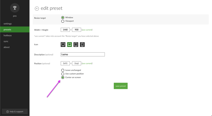 設定画面「Presets」から任意のサイズをクリックし、「Position」セクションのラジオボタンを「Center on screen」にチェックします。